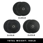 PRCTZ 160 lb Rubber Bumper plate bundle comes in 10, 25, and 45 lb. The bumper plates were designed to be compatible with all 2" Olympic barbells. Our rubber vulcanized plates are great for quiet impact compared to traditional cast iron training plates. These plates are great for muscle building exercises including squats, bench, and deadlifts.