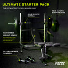 The PRCTZ SP1 Homegym Bundle - your gateway to building strength, sculpting your physique, and achieving your fitness goals right in the comfort of your own home! The ultimate full body collection of essential workout equipment for your home gym, featuring a sturdy Weight Bench with rack combo, a versatile 7 ft Olympic Barbell, 45 lb Rubber Bumper Plates, and convenient 40lb Cast Iron Adjustable Dumbbells. PRCTZ LLC has been the fitness training accessory and equipment expert since 1986, and all our products are 100% safety regulated being the #1 trusted choice by exercisers at any skill levels. We continue to innovate and create new ways to encourage active and healthy lifestyle.