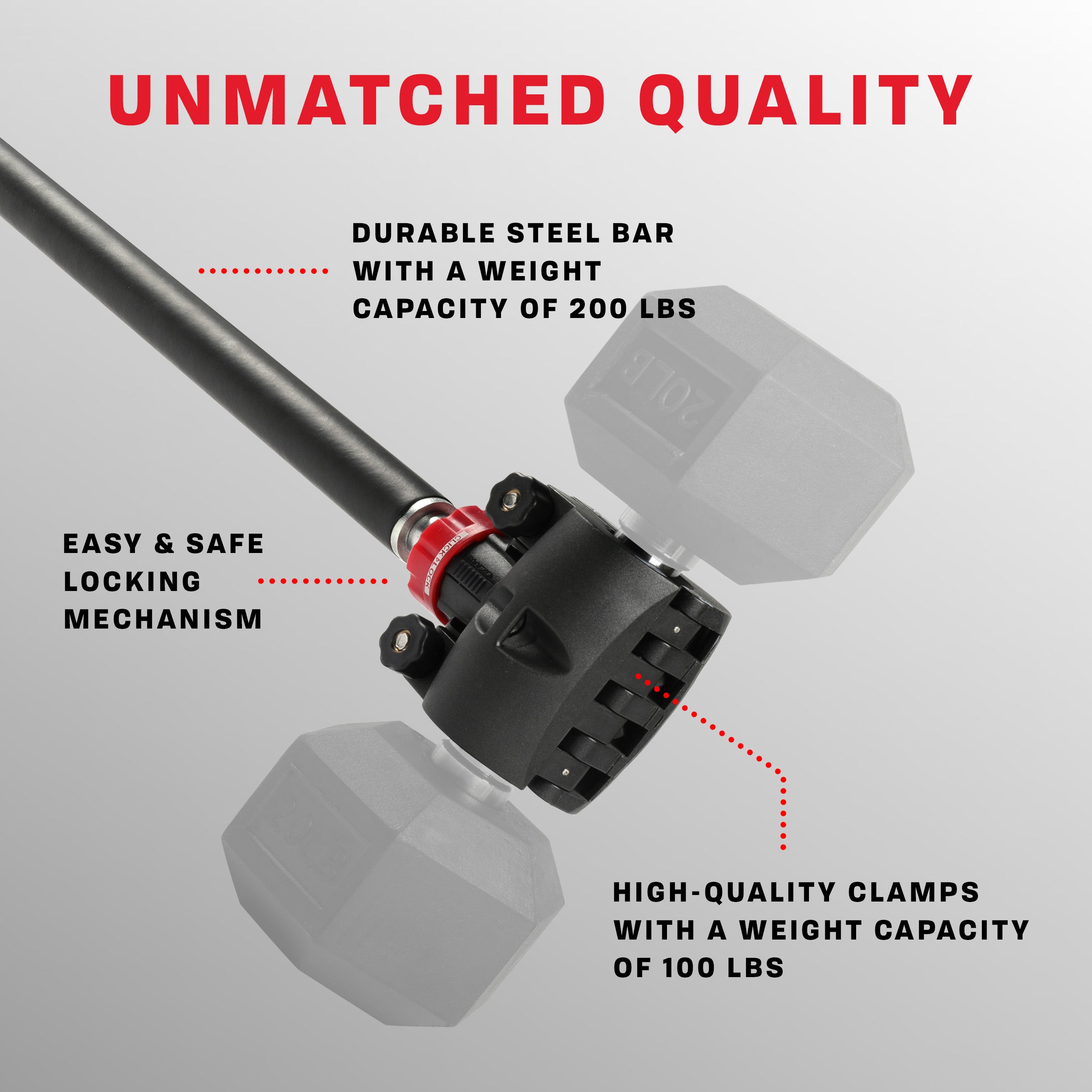 Unleash the full potential of your home gym with PRCTZ Modular Weight Training Barbell bar, designed to transform your cast iron dumbbells, rubber hex dumbbells, adjustable dumbbell set, and resistance tube set into a heavy-duty weight bar for intensive weightlifting and strength training. The weight training barbell bar comes with two detachable dumbbell clamps can accommodate curved or straight dumbbell handles up to 1.5 inch in diameter and minimum handle length of 4.5”. The clamps also feature built-in resistance tube adapters allowing easy assembly. Just simply clip the carabiners to the adapters to start your curls, tricep extensions, lat pull exercises and more. The whole modular training barbell bar system can hold up to 200lbs, 100lbs each side, and is 45.5” at total length, allowing it rack-able on your home gym squat rack and weight bench. Seamlessly integrate it into your existing home gym setup for a complete workout experience.