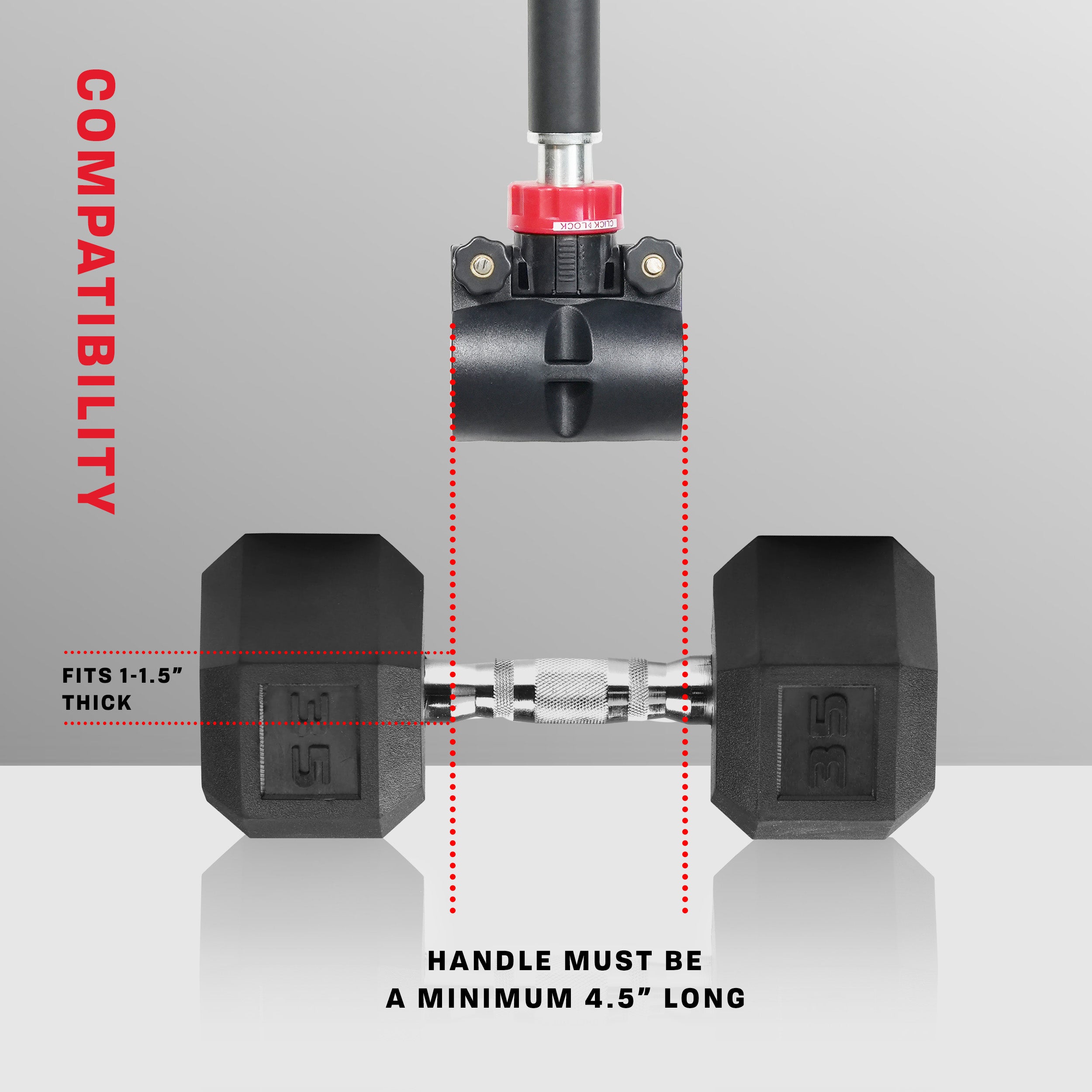 • Dumbbell clamps can accommodate curved or straight dumbbell handles up to 1.5 inch in diameter and minimum handle length of 4.5”