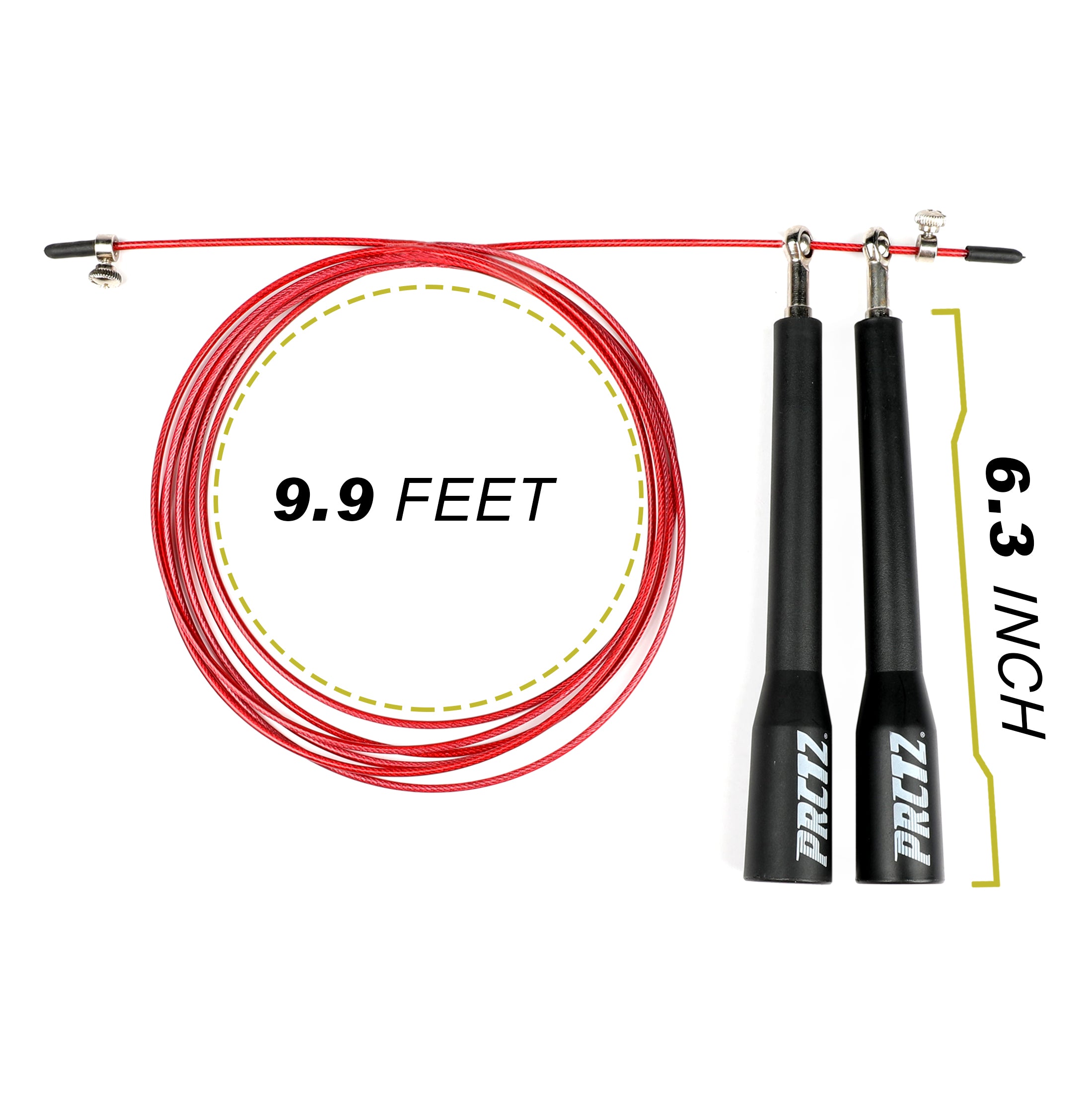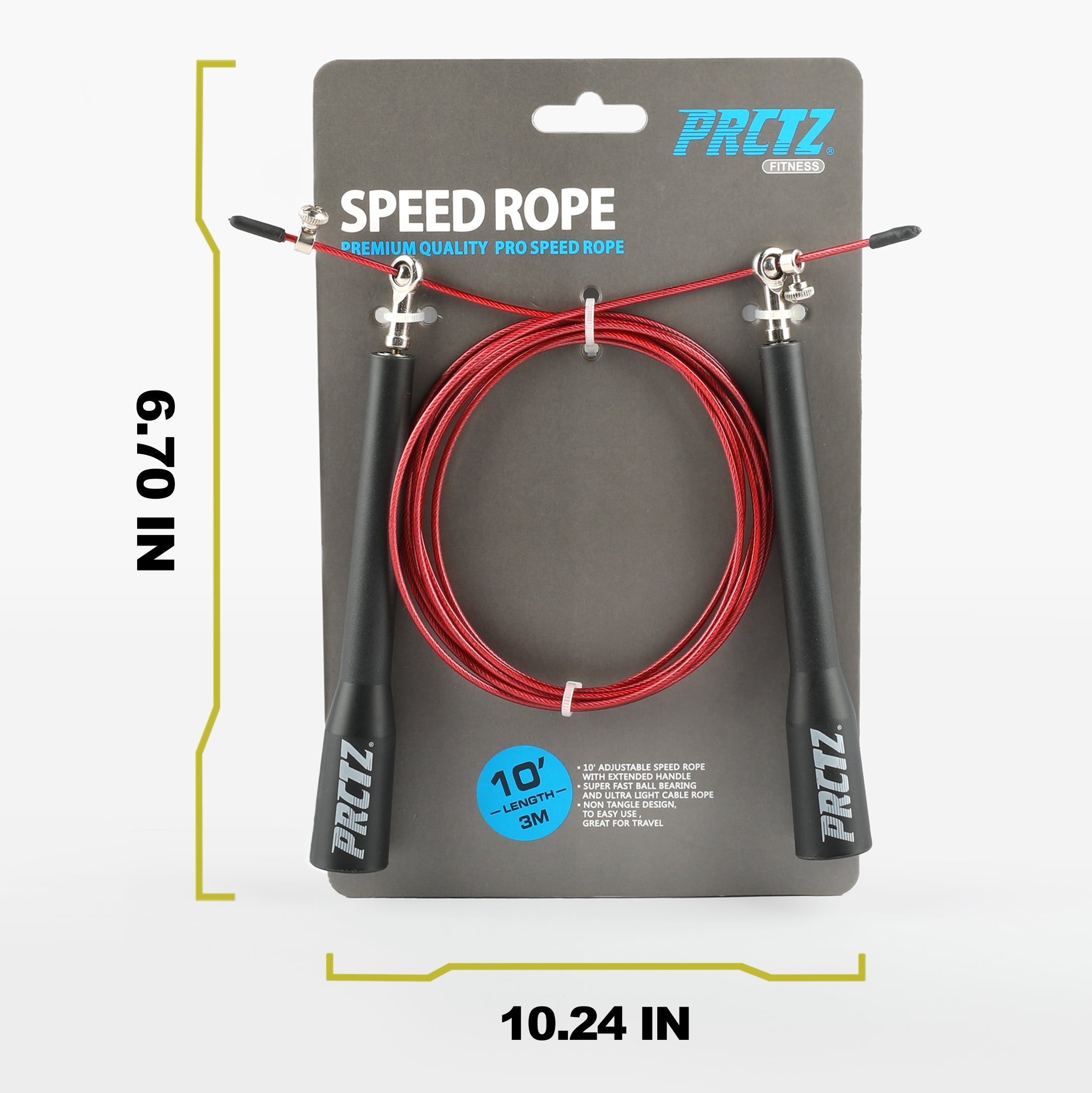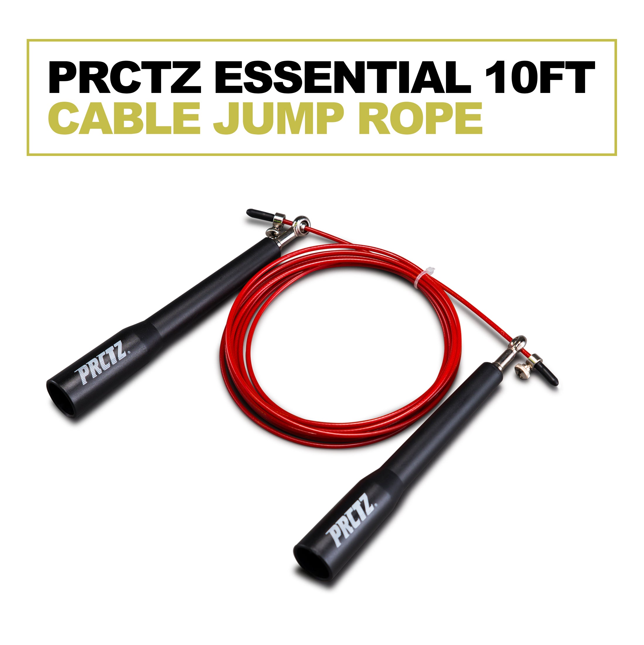 PRCTZ 10ft Cable Jump Rope is a great addition to your cardio workout. Ergonotic long plastic handles will help you with maximum rotation and keep your jumps nice and clean. The smooth frictionless rotation ensures faster spins so that you can burn more fat. PRCTZ Essential 10ft Cable Jump Rope features a thin cable design coated with clear plastic for safety and durability. The adjustable sizing and the ability to cut the cable let you create a jump rope that's the right length for a great workout.Jump rope is proven to be a great heart healthy cardiovascular exercise to help increase agility, coordination, and endurance. Great for all athletes looking for a good burn. Compact and portable for indoor and outdoor exercises.