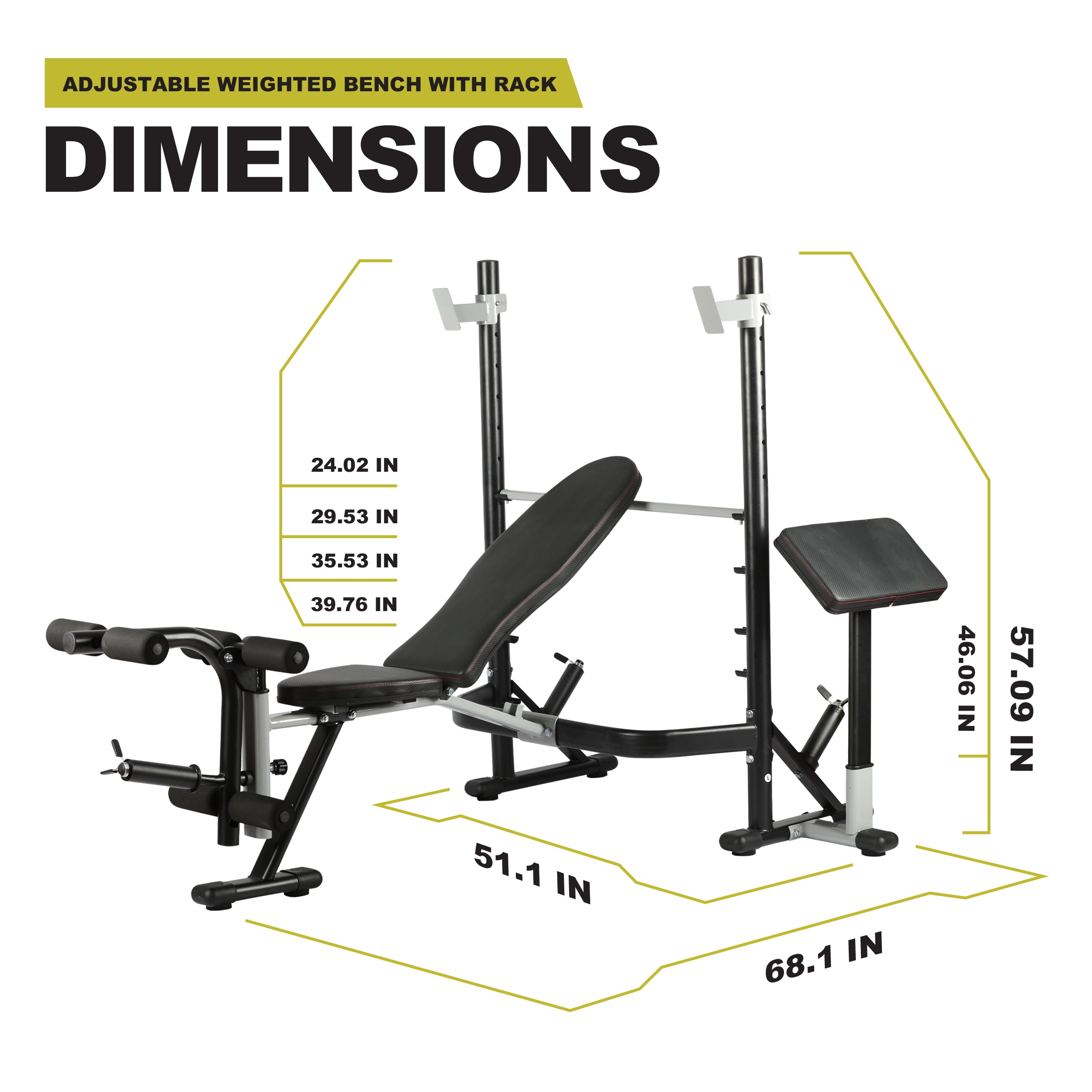 PRCTZ Olympic Weight Bench with Rack for Full-Body Workout is the ideal at home muscle building and strength training machine. The heavy duty main frame is made from high quality steel tubing and designed to support a maximum user weight of 300 lb., and a maximum total weight of 620 lb.. The integrated safety spotters prevent injury and can be transformed into a squat and power lift station. This full-body workout bench allows you to perform a variety of upper and lower body workouts with the detachable and padded leg developer or the preacher curl pad. After the workouts are finished, the built-in weight plate storage help organize your grip plates or bumper plates easily. PRCTZ LLC has been the fitness training accessory and equipment expert since 1986, and all our products are 100% safety regulated being the #1 trusted choice by exercisers at any skill levels. We continue to innovate and create new ways to encourage active and healthy lifestyle.