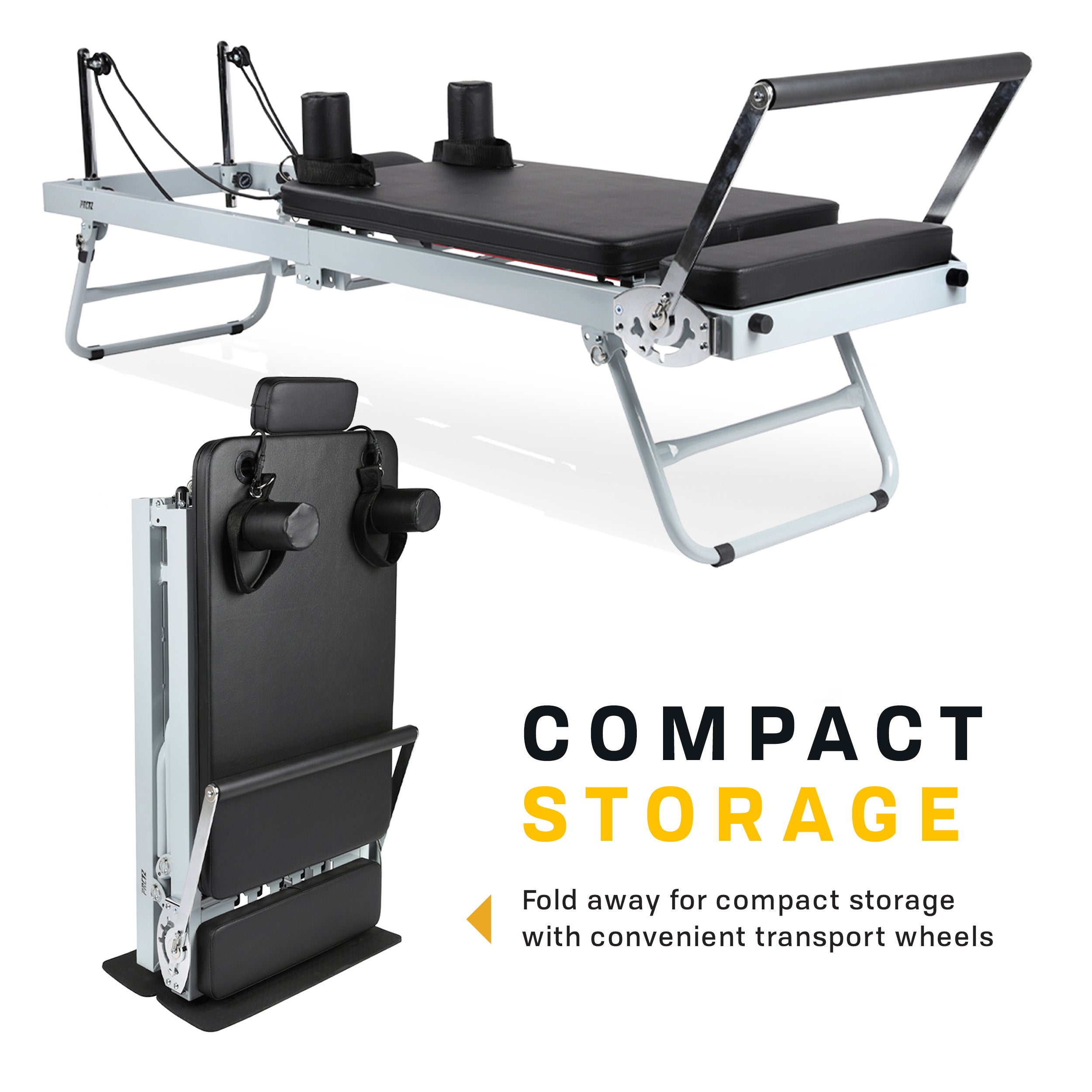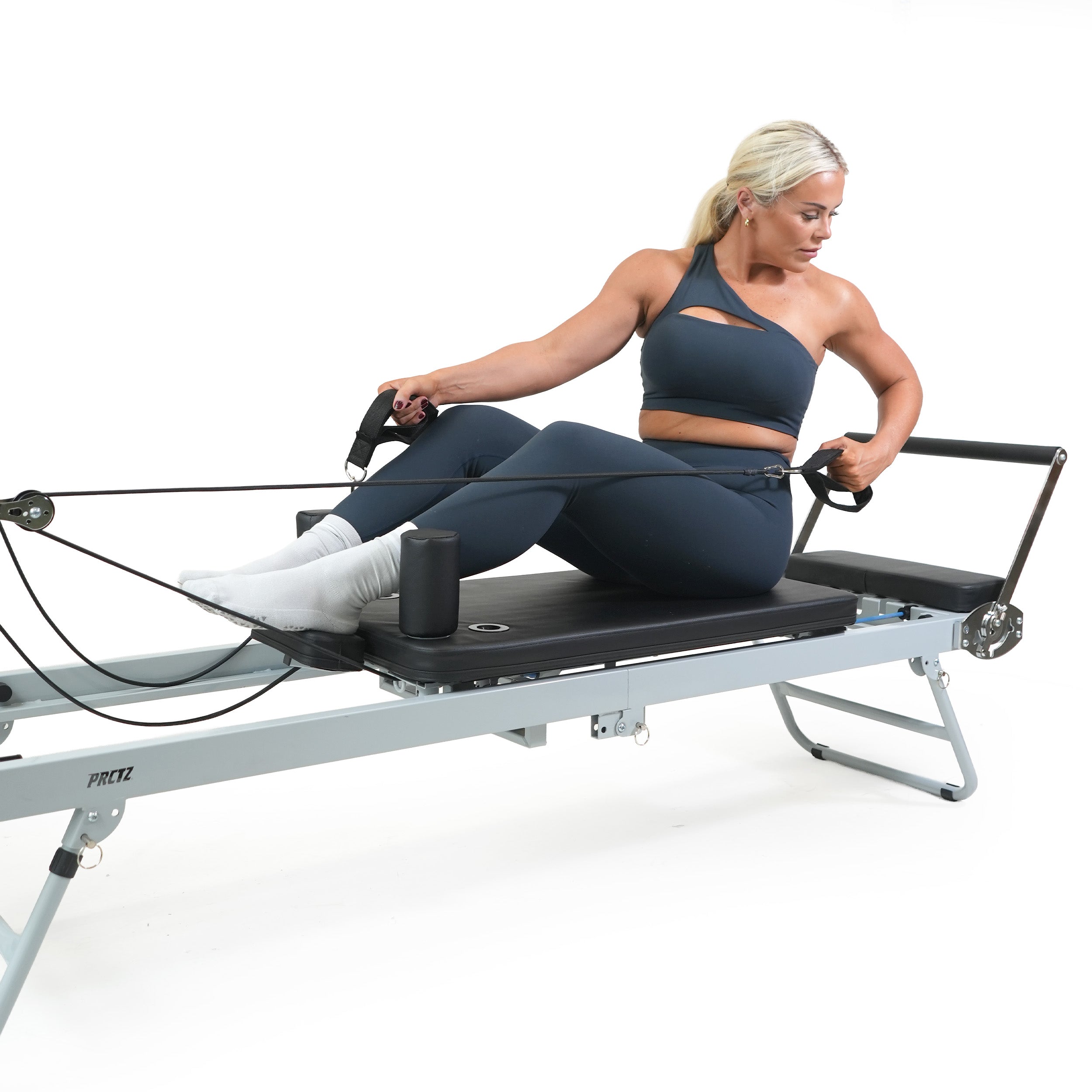 The PRCTZ at-home Pilates reformer is a compact, high-quality piece of equipment designed for full-body workouts. With adjustable resistance, a smooth-gliding carriage, and versatile accessories, it offers a low-impact way to improve strength, flexibility, and posture from the comfort of your home. Ideal for all fitness levels, it provides a customizable and effective Pilates experience.