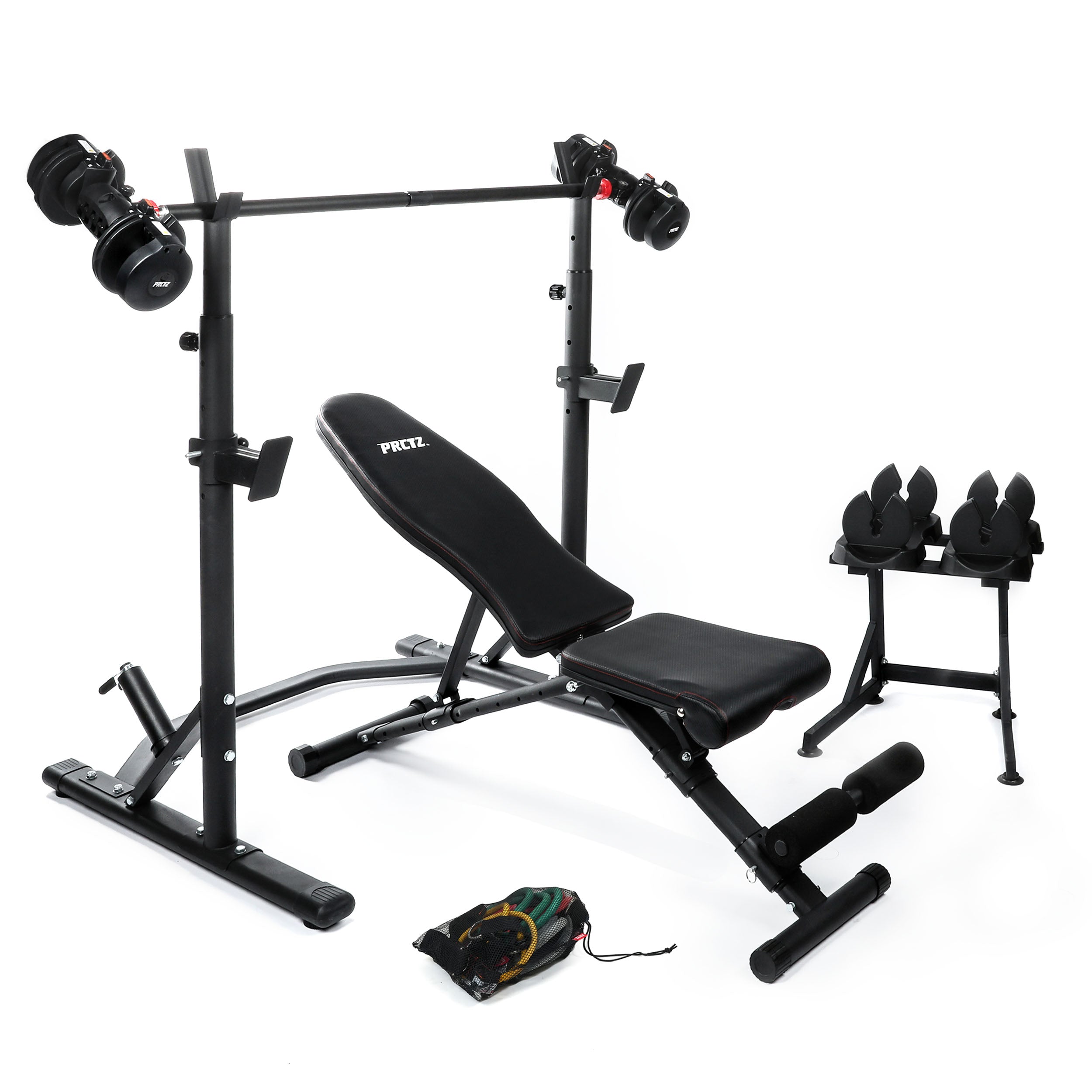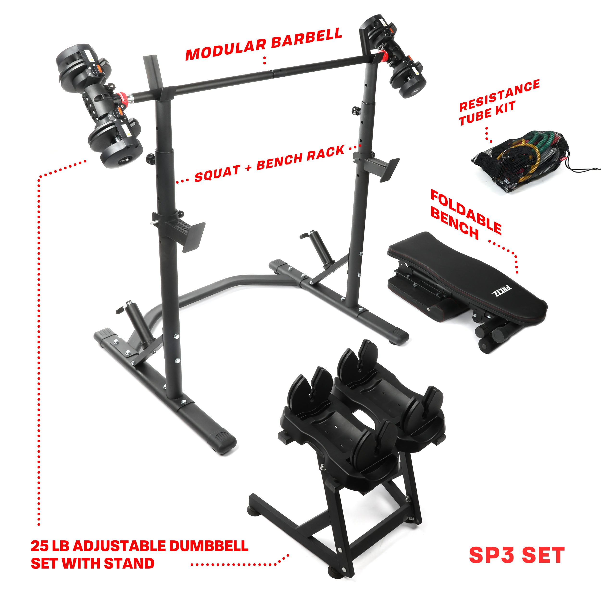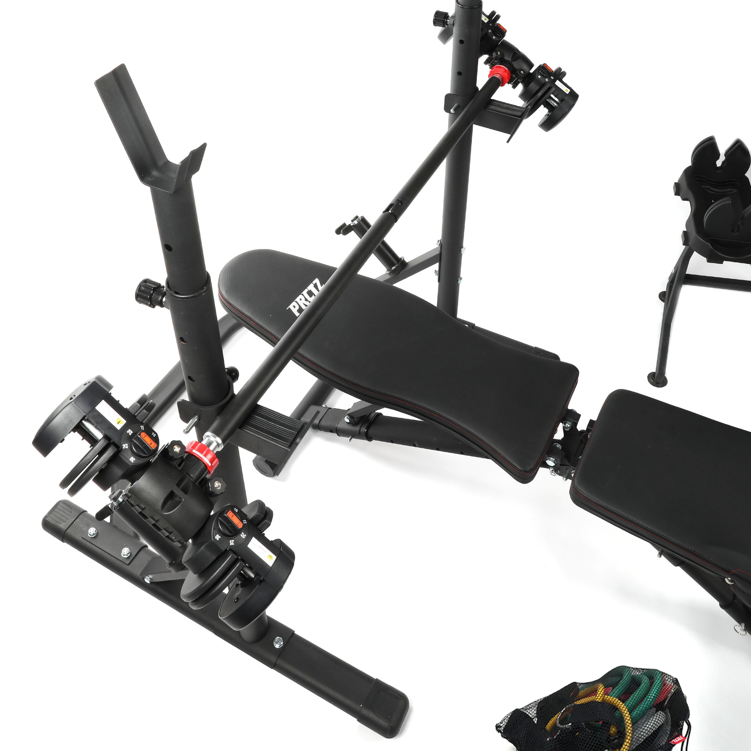 PRCTZ SP3 Homegym Bundle, Includes Two-Piece Olympic Weight Bench with Squat Rack, 6ft Modular Barbell, 10-30lb Quick Select Adjsutable Dumbbell, Resistance Tube Set
